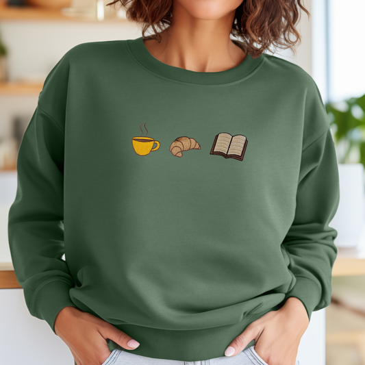 Book Lover Embroidered Sweatshirt | Coffee & Croissant Design | 11 Color Options