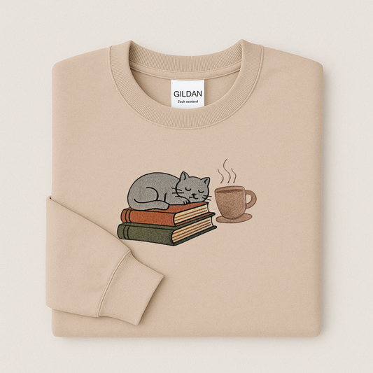 Cozy Cat on Books Embroidered Sweatshirt | Gildan | 11 Color Options