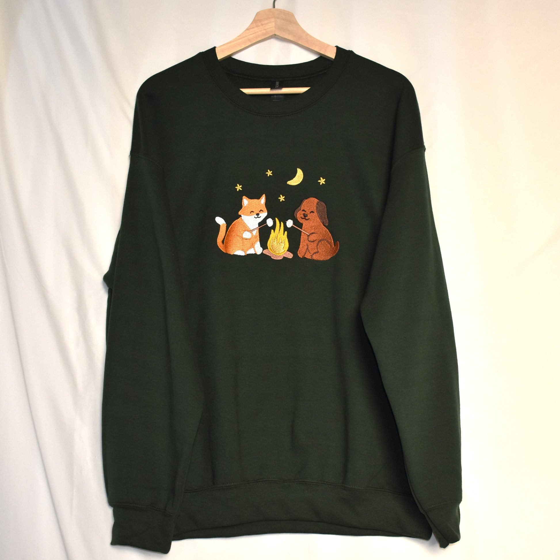 This whimsical embroidered sweatshirt features a cheerful fox and dog roasting marshmallows over a glowing campfire beneath the stars and moon. A playful, cozy design that’s perfect for animal lovers and camping enthusiasts alike.