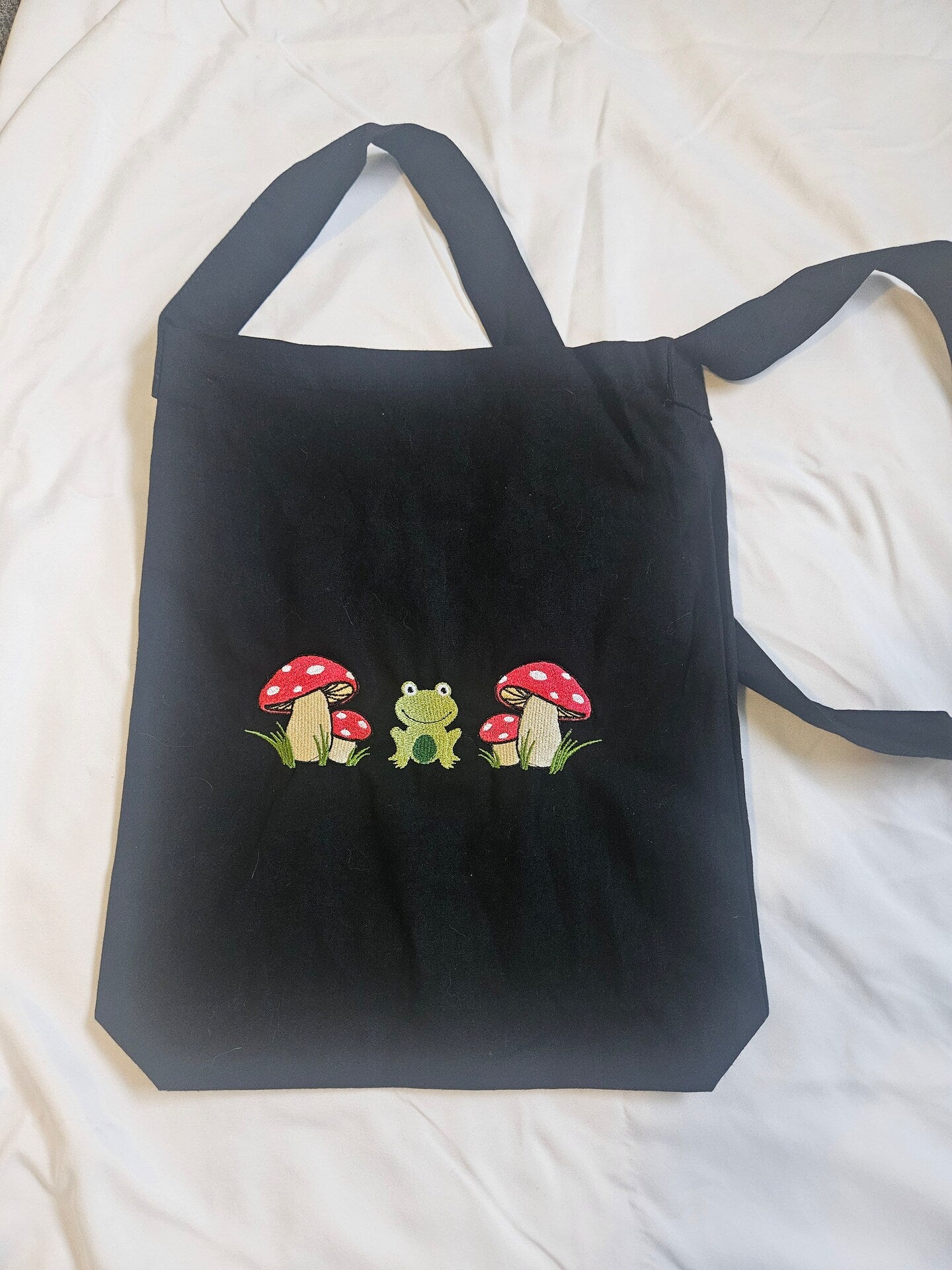 Embroidered Canvas Sling Bag, beautiful design Frog with Mushrooms. Durable but light weight.