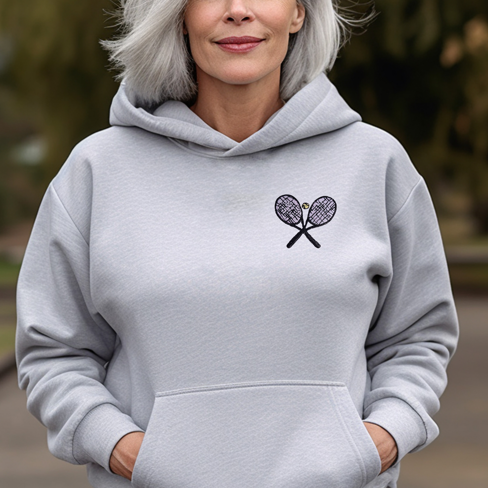 An embroidered sweatshirt featuring a design of two tennis rackets with a tennis ball in between is a sporty and dynamic piece, ideal for tennis enthusiasts. The embroidery showcases two crossed tennis rackets, with the strings and handles finely detailed. Positioned centrally between the rackets is a bright, eye-catching tennis ball. Perfect for tennis lovers, this sweatshirt can be worn casually to a match, at practice, or just as a sporty fashion statement. It can also be a great gift for someone who enjoys the sport.