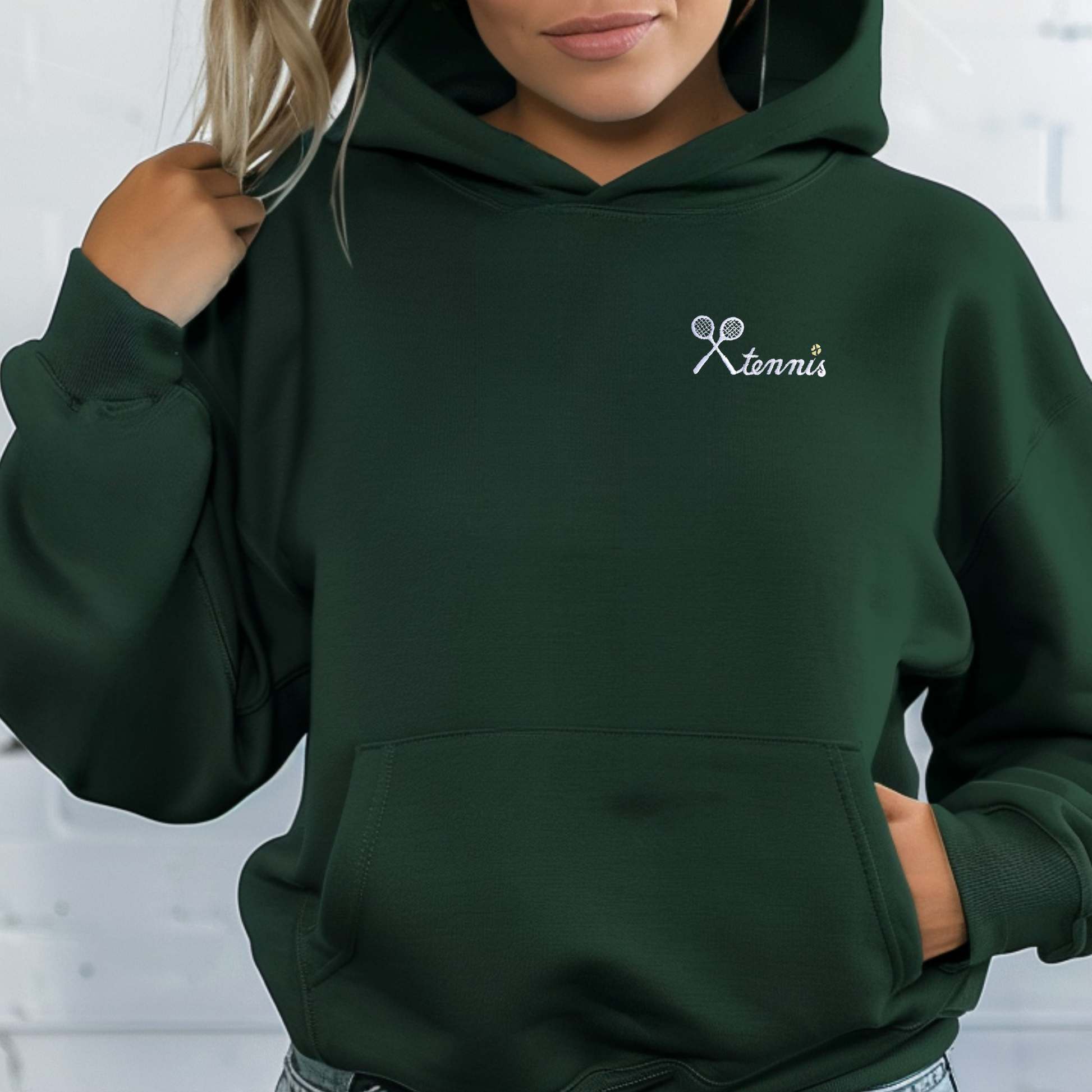 An embroidered sweatshirt featuring two tennis rackets next to a flying tennis ball above the word "Tennis" brings a sporty and dynamic feel to casual wear. The embroidery showcases two crossed tennis rackets, positioned beside a tennis ball in mid-flight, adding a sense of motion and energy. The tennis ball is depicted with a subtle motion trails to emphasize its movement, while the rackets have intricate, finely detailed strings and handles. Below this lively scene is the word "Tennis" in bold, sporty typography. The entire design combines action with a clear passion for the sport. Ideal for tennis players, fans of the sport, or those looking for a sporty, athletic-inspired style. Great for wearing to practice, casual outings, or layering over athletic wear.
