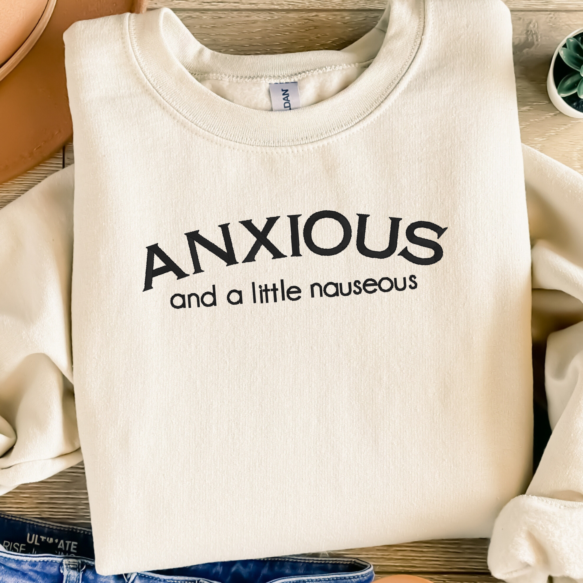 Stay cozy while keeping it real with this Anxious embroidered sweatshirt. Featuring the phrase “Anxious – and a little nauseous” stitched in bold embroidery, this design blends humor and honesty into a comfortable, everyday essential.