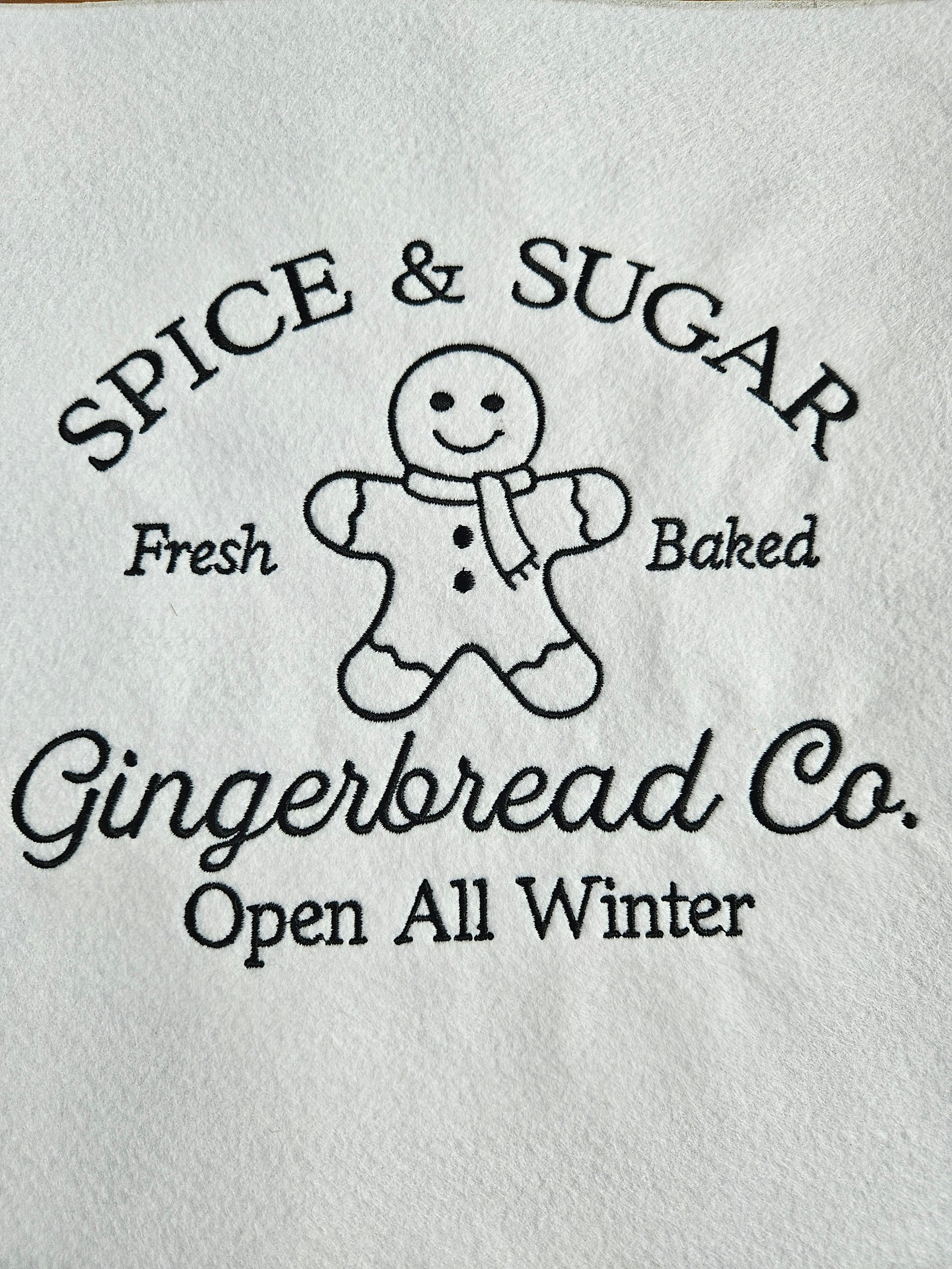 Step into holiday coziness with this Gingerbread Co. embroidered sweatshirt! Featuring the text “Spice & Sugar, Fresh Baked, Gingerbread Co. – Open All Winter” with a cheerful gingerbread man, this design has the charm of a festive bakery sign brought to life in embroidery.