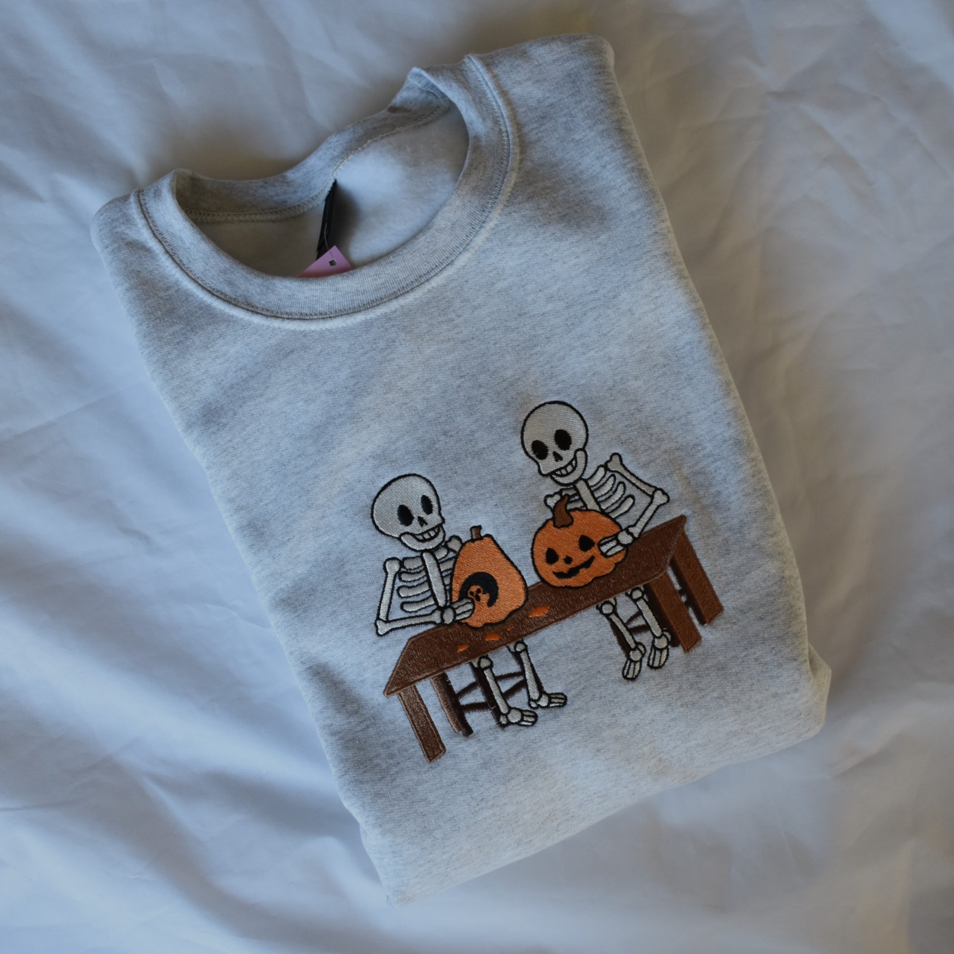 Skeletons Carving Pumpkins Embroidered Sweatshirt | Custom Halloween Crewneck or Hoodie | 11 Colors | Made to Order