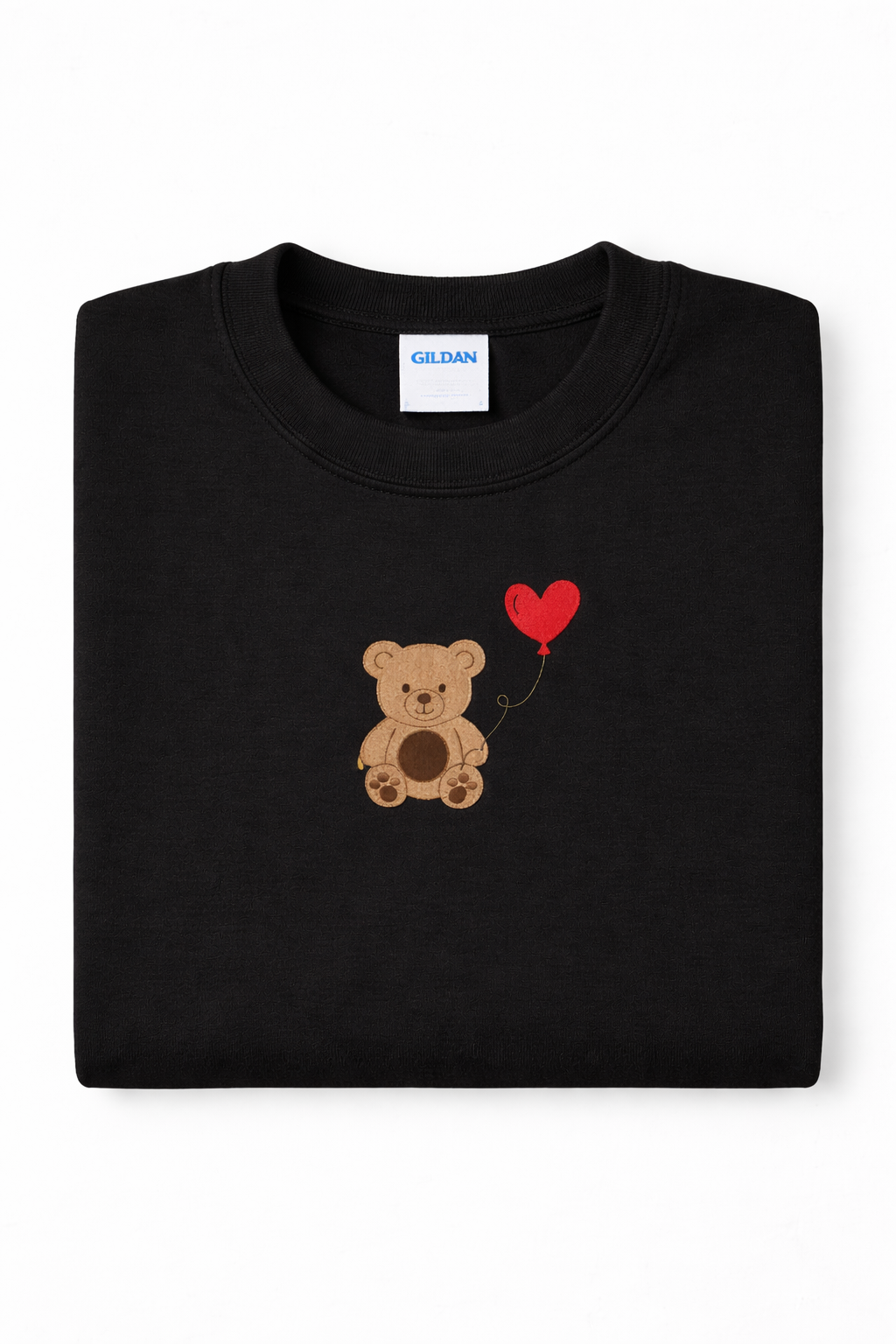 This embroidered teddy bear sweatshirt features a sweet bear holding a heart balloon, stitched with care for a soft, timeless look. Perfect for everyday wear or as a thoughtful gift, this design adds a cozy and charming touch to any outfit.