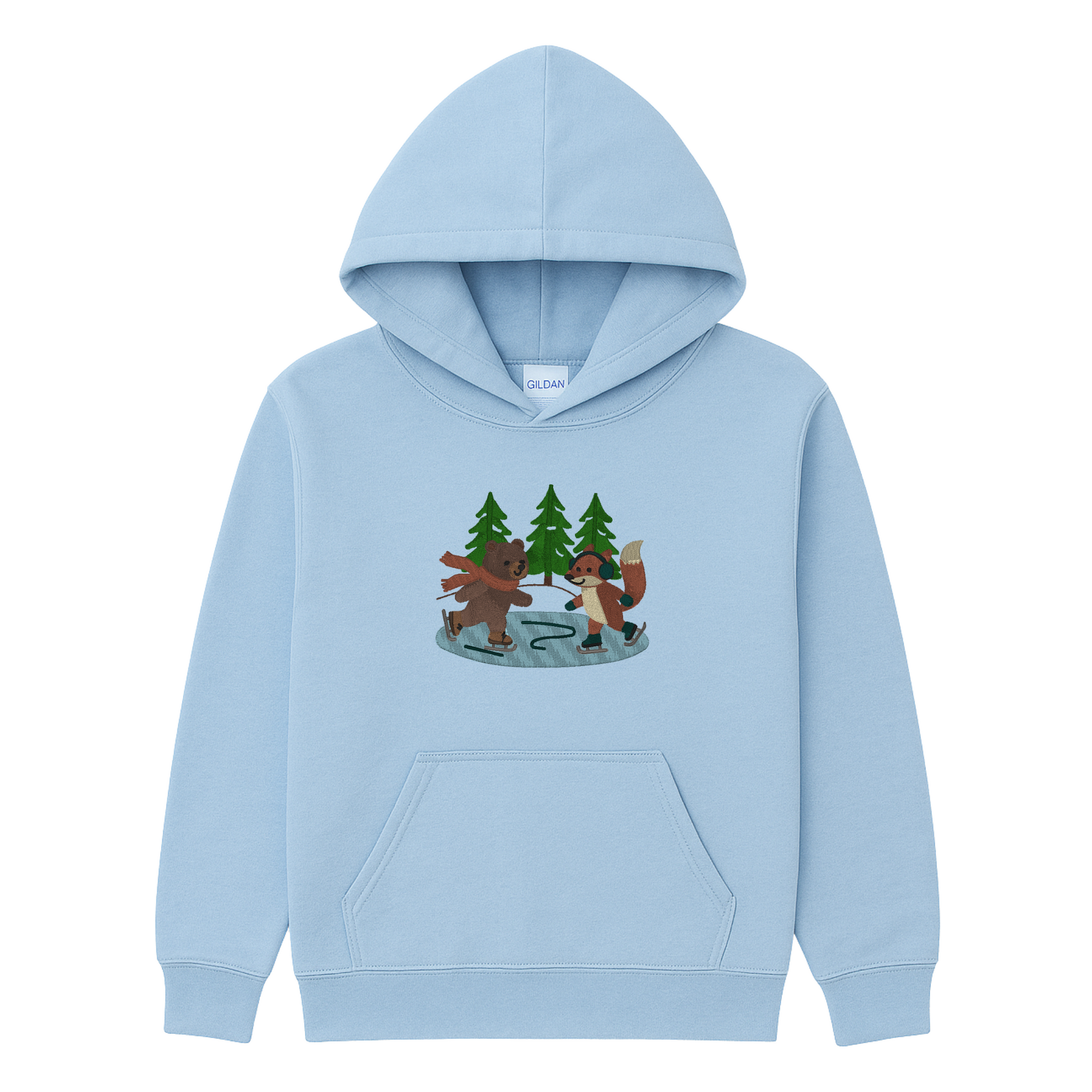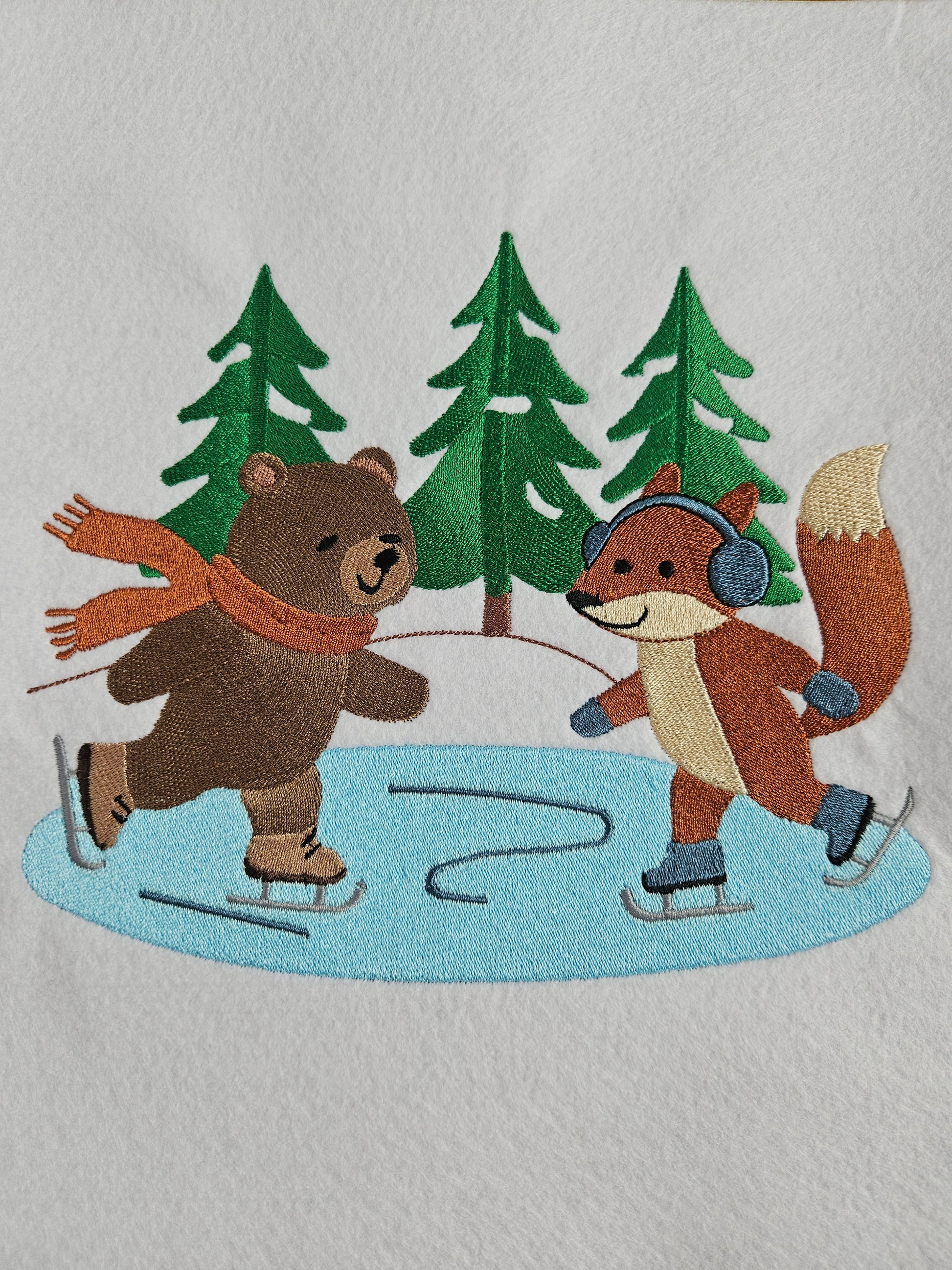 Glide into the winter season with this Woodland Ice Skating embroidered sweatshirt! Featuring a cozy bear and fox holding hands while skating on a frozen pond surrounded by evergreen trees, this whimsical design is stitched with high-quality embroidery that captures the joy of winter fun.